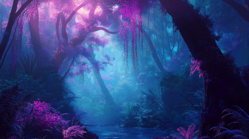 Vezi detalii completeTapet junglă mistică | Peisaj tropical cu lumină violetă și albastră