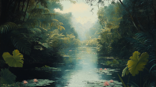 WonderMuralTapetul nostru evocă o junglă serenă în care lumina moale se strecoară printre frunzele luxuriante. Pictura prezintă un lac liniștit punctat cu nuf...