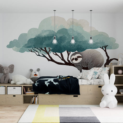 WonderMuralAcest tapet mural fermecător prezintă un leneș pașnic așezat pe o ramură, înconjurat de nuanțe liniștitoare de verde și albastru. Ilustrația, creat...