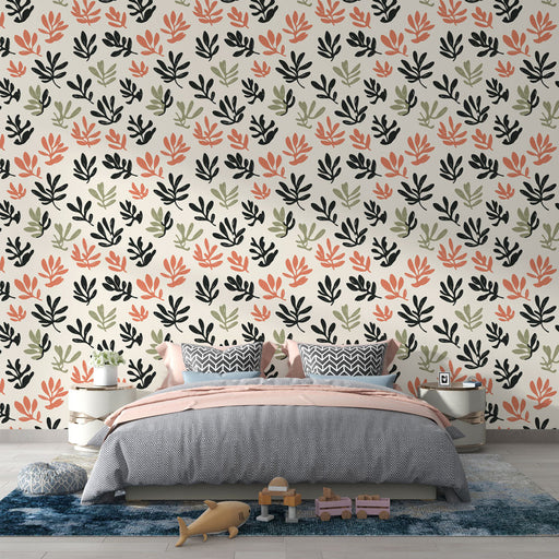 WonderMuralDescoperiți tapetul nostru cu modelul delicat al frunzelor variate, ilustrat în nuanțe moi de coral, negru și verde pe un fundal crem calmant. Aces...
