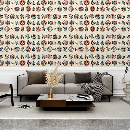 WonderMuralAcest tapet mural prezintă un frumos model de flori stilizate în nuanțe calde de roșu, portocaliu și bej, creând un contrast puternic împotriva fun...