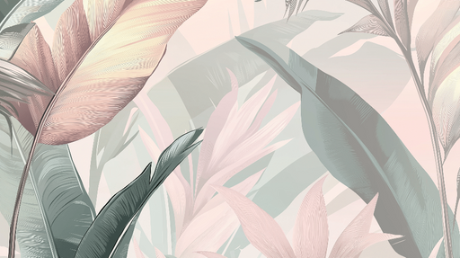 WonderMuralAceastă tapet captivantă prezintă un amestec armonios de frunze tropicale în nuanțe delicate de roz, verde și bej, evocând o atmosferă liniștită și...