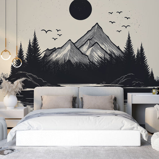 WonderMuralAceastă captivantă tapet mural prezintă un peisaj montan delicat ilustrat în alb și negru, creând o atmosferă mistică și liniștitoare. Vârfurile ac...