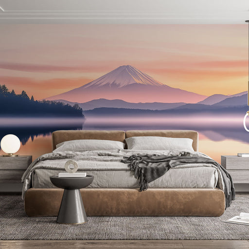 WonderMuralAceastă captivantă tapet mural prezintă o vedere iconică a Muntelui Fuji scăldat într-un apus de soare spectaculos. Nuantele calde de portocaliu și...