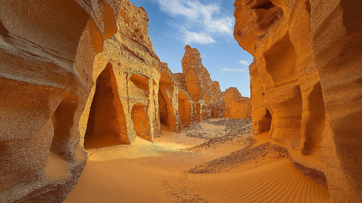 Această imagine spectaculoasă surprinde interiorul unei peșteri cu o deschidere magnifică, dezvăluind un cer albastru strălucitor. Pereții de rocă neregulați se ridică în jur, creând un cadru natural impresionant care atrage privirea în sus. Textura rocilor, variind de la tonuri calde la gri, adaugă o dimensiune tactilă și sculpturală imaginii.