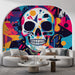 Această tapet mural dinamică prezintă un craniu ornamentat, emblematic pentru stilul artistic modern cu accente de artă pop. Culori vii, precum albastru, portocaliu și galben, se îmbină îndrăzneț cu modele abstracte și elemente geometrice, creând o impresie de vitalitate și energie. Textura vizuală este bogată, cu zone care par să curgă sau să stropească, aducând ilustrația la viață.