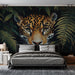 Această captivantă tapet mural prezintă fața impunătoare a unui jaguar, ieșind din frunzișul luxuriant al unei jungle tropicale. Contrastul dintre blana portocalie cu pete a jaguarului și verdele intens al frunzelor creează o atmosferă vibrantă și sălbatică, ideală pentru a aduce o notă de exotism în interiorul tău.