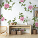 Această tapet shabby chic prezintă un model frumos de trandafiri roz înconjurați de frunziș proaspăt pe un fundal alb strălucitor. Trandafirii, cu petalele lor delicate și nuanțele pastelate, aduc un aer romantic și elegant interiorului tău.