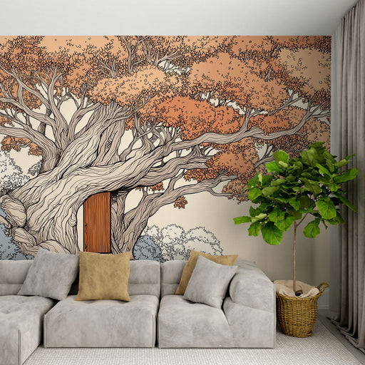 WonderMuralTa fotografska tapeta razkriva izjemno drevo z masivnim in zvitim deblom, okrašenim s pregrešno oranžnimi listi. Na dnu drevesa vabljiva lesena vra...