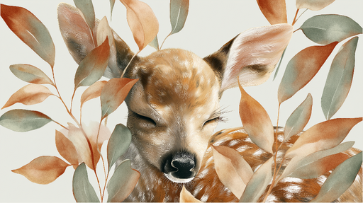 WonderMuralTa prekrasna tapeta prikazuje nežnega srnčka, mirno zaspalega, obdanega z listjem v nežnih odtenkih zelene in opečnate barve. Podrobne teksture in ...