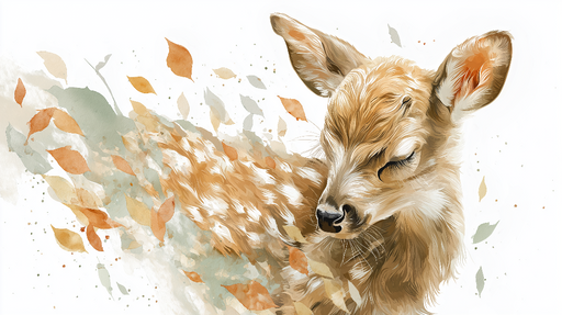 WonderMuralTa ozadje prikazuje ljubkega srnja, ki mirno spi, nežno obdan z barvitimi listi v toplih odtenkih. Očarljiva ilustracija, ustvarjena v ročno naslik...