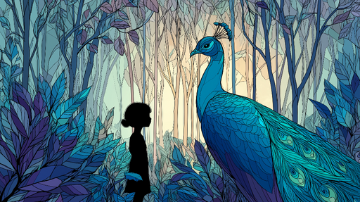 WonderMuralNajina izključna tapeta prikazuje čudovito ilustracijo živahnega pavja s svetlečimi peresi, ki stoji mogočno pred silhueto otroka. Prizor se odvija...