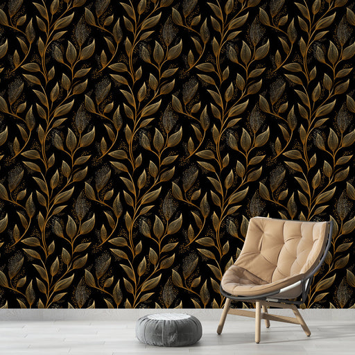 WonderMuralTa ozadje prikazuje eleganten vzorec zlatega listja, ki cveti na globoko črnem ozadju, ustvarjajoč vizualni učinek, ki je hkrati sofisticiran in to...