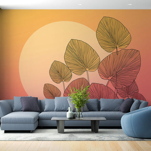 WonderMuralNaša tapeta prikazuje eleganten vzorec grafičnih listov z nežnimi obrisi, ki se izstopajo na ozadju preliva toplih barv od rumene do roza. Ta sodo...