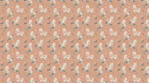 WonderMuralTa očarljiva tapeta prikazuje ljubke samoroge obkrožene z nežnimi, pisanimi cvetovi na toplem breskovem ozadju. Pastelne barve in cvetlični vzorci ...