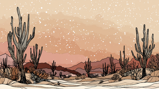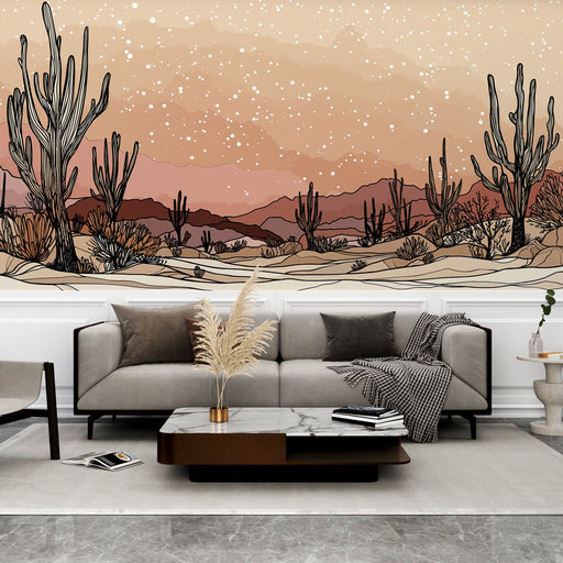 WonderMuralTa ozadje ponuja umetniško upodobitev pomirjujoče puščavske krajine, kjer visoki kaktusi stojijo ob pastelnih gorah. Ilustracija poudarja preprosto...