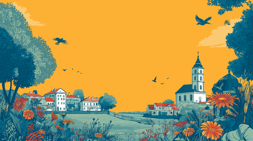 WonderMuralTa fototapeta predstavlja prelep vasinski krajolik, kjer se pod zlatim nebom odvija živahna vas. S svojimi hišami z rdečimi strehami, nežno oblikov...