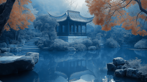 WonderMuralOdkrijte to očarljivo tapeto z azijskim paviljonom, obkroženim s spokojnim vrtom, kjer se odtenki modre prepletajo z oranžnimi poudarki. Vodni deta...