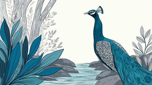 WonderMuralTa tapeta ilustrira vzvišenega pavlina, narisana s preciznostjo, ki poudarja perje v odtenkih modre in vijolične barve. Dinamičen in stiliziran diz...