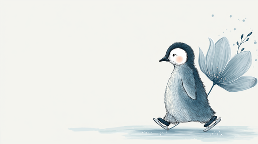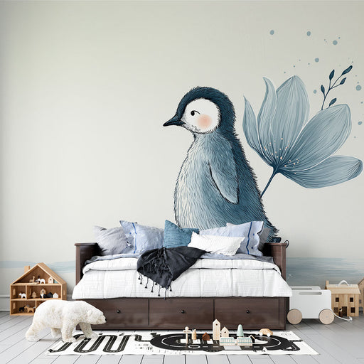 WonderMuralTa igriva Tapeta prikazuje ljubkega pengvina med drsanjem, občudovanje ilustrirane rože, ki doda pridih sladkosti. Odtenci modre barve in drobni de...