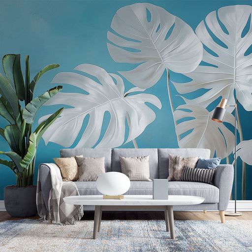WonderMuralTa tapeta v teal modri barvi vsebuje velike bele monstera liste, ki dodajo tropski in sodoben pridih vašemu notranjemu prostoru. Kontrast med živah...