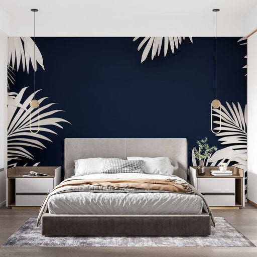 Ogled celotnih podrobnostiMuralna tapeta modrikasto modra | Bele tropske liste na temno modrem ozadju