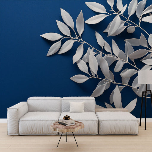 Ogled celotnih podrobnostiMural Wallpaper teal modra | Vzorec belih listov na temno modrem ozadju