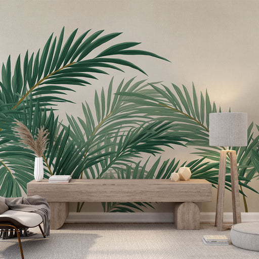 WonderMuralTa ozadje prikazuje lep vzorec palminih listov, nežno narisanih v beli barvi na globoko zelenem ozadju. Ta dizajn vzbudi tropsko vzdušje, prinaša p...