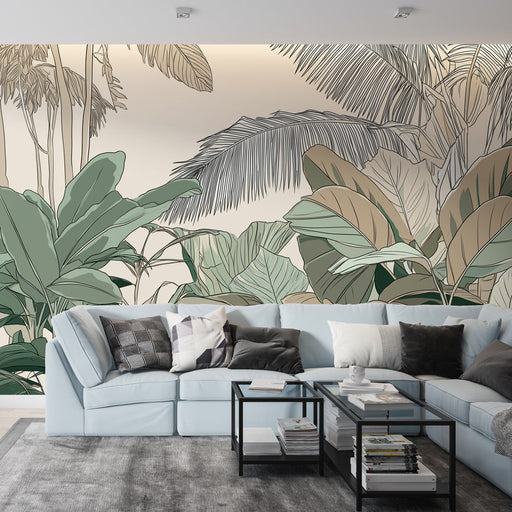 WonderMuralTa fototapeta prikazuje čudovit vzorec tropskega listja, bogat z odtenki zelene barve, ki združuje organske elemente s toplim bež ozadjem, ki vzbud...