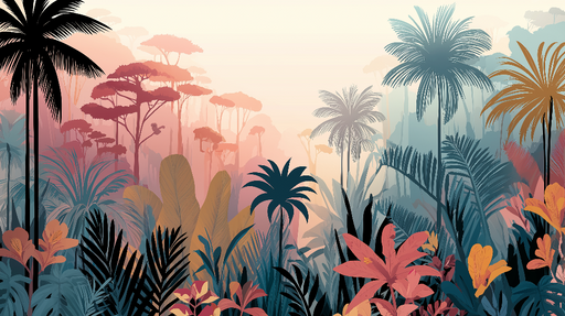 WonderMuralOdkrijte naše ozadje, navdihnjeno z tropskim džunglom, ki ponuja očarljivo mešanico bujne vegetacije in nežnih pastelnih tonov. Elegantne palme sto...