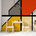 Ta sodobna fotografska ozadja prikazuje drzno geometrijski dizajn, ki združuje abstraktne oblike in svetle barve, kot so oranžna, rumena, siva in bež. Črne črte, ki določajo različne odseke, dodajo grafično in elegantno dimenzijo, popolno za sodobne interierje.