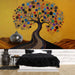 Ta edinstvena fotografska tapeta prikazuje stilizirano drevo s tankimi vejami, posutimi z barvnimi krogi na svetlo zlati rumeni podlagi. Vsak krog je skrbno oblikovan, dodaja pridih teksture in globine umetnini, s tem pa ustvarja toplo in živahno vzdušje.