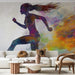 Ta dinamična ilustracija stenske tapete prikazuje silhueto ženske v polnem koraku, obkroženo z eksplozijo živahnih barv. Odtisi vijolične, oranžne in rumene barve se mešajo s pridihi zelene in modre, ustvarjajoč občutek gibanja in energije. Mehka tekstura v ozadju ponuja pomirjujoč kontrast barvnim izbruhi, kar to stensko tapeto dela idealno za poživitev prostora.