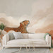 Ta fotografska tapeta prikazuje mirno tigrico, ki počiva med pastelnimi oblaki, ustvarjajoč pomirjujoče in sanjsko vzdušje. Topli odtenki rožnate in oranžne se ujemajo z mehkejšimi toni, dodajajoč globino in toplino vašemu notranjemu prostoru.