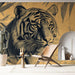 Ta očarljiva fotografska tapeta prikazuje podrobni portret mogočnega tigra, ki očara s svojim intenzivnim pogledom in progastim krznom. Ilustracija se harmonično zlije v zlate ozadje, poudarjajoč moč in lepoto tega ikoničnega živali. Vzorci listja dodajo pridih narave, ustvarjajoč vzdušje, ki je divje in elegantno.