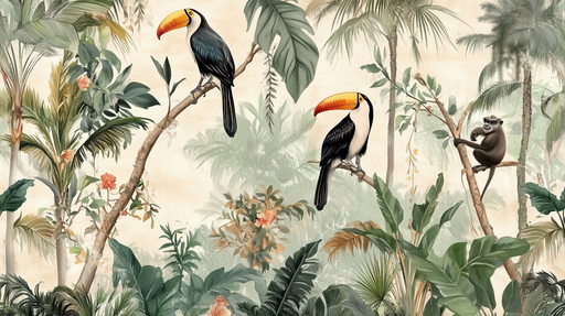 Art'loloDodajte eksotičen pridih svoji notranjosti z našo tropsko tapeto, ki prikazuje pisane tukane in nagajivega opico, skrite med bujno vegetacijo. Popo...