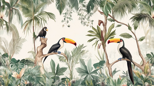 WonderMuralNajlepši naš tapete ima očarljiv tropski motiv, ki prikazuje pisane tukane med bujno vegetacijo. Živahne barve ptic, združene z globokimi odtenki l...