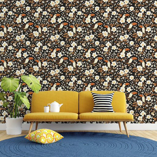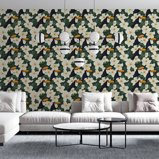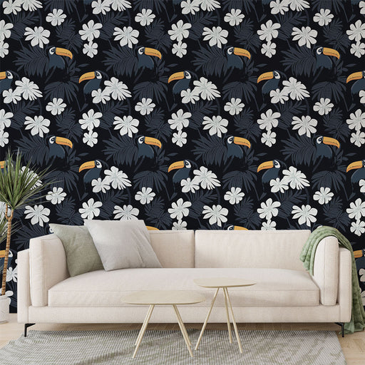 WonderMuralNaša čudovita Tapeta prikazuje drzno tropski motiv, z barvitimi tukani ob občutljivih belih cvetovih. Črna ozadje poudari svetle barve ptic in cvet...