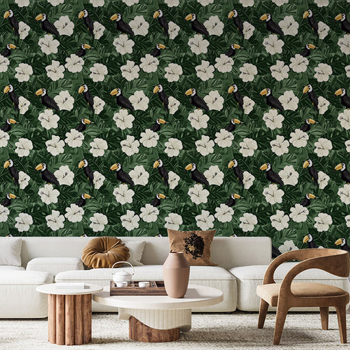 WonderMuralNaša tapeta prikazuje živahen vzorec tukani, ki posedajo med prelepimi belimi hibiskusi na bujnem zelenem ozadju. Drobni detajli cvetja in ptic dod...