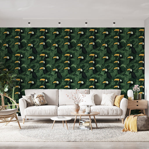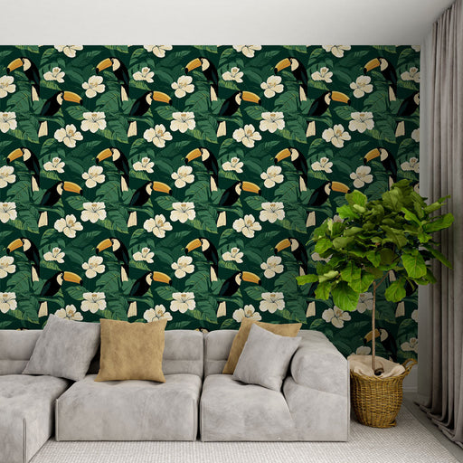 WonderMuralOdkrijte naše ozadje okrašeno z barvitimi tukanji, zasidrani med bujnimi tropskimi listi. Globoko, bogato zeleno ozadje ustvarja vzdušje bujnega de...