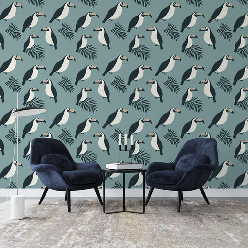 WonderMuralNaša tapeta prikazuje zabaven tukan vzorec na pomirjujočem modrem ozadju, obkrožen z eksotičnimi listi. Kontrastne barve ptic s svojimi velikimi kl...