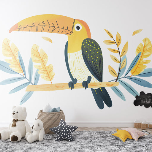 WonderMuralTa ilustracija prikazuje majestetičnega tukana, ki nežno poseduje na veji, obdan z listi v nežnih odtenkih rumene in modre barve. Perje ptice je po...