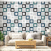 Ta ta geometrična fotografska tapeta prikazuje vzorec večbarvnih kvadratov, ki združuje odtenke modre in sive na subtilnem sivem ozadju. Idealno za dodajanje sodobnega in dinamičnega pridiha kateri koli sobi, popolnoma se prilega sodobnim ali minimalističnim prostorom.
