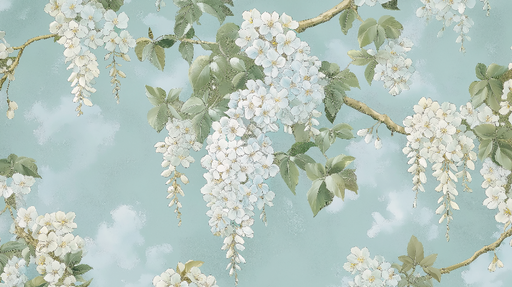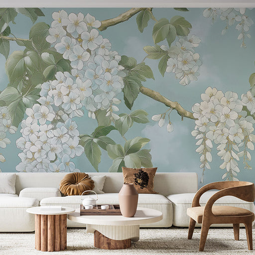 WonderMuralTa lepo ilustrirana tapeta poudarja nežne glicinije in bele cvetove na umirajočem pastelno modrem ozadju. Cvetovi, s svojimi nežnimi odtenki bele i...