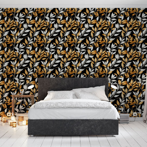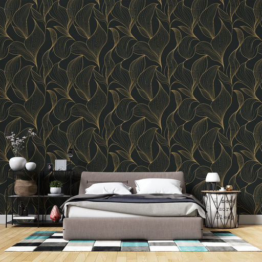 WonderMuralTa ozadje prikazuje eleganten vzorec zlatega listja, ki cveti na globoko črnem ozadju, ustvarjajoč vizualni učinek, ki je hkrati sofisticiran in to...