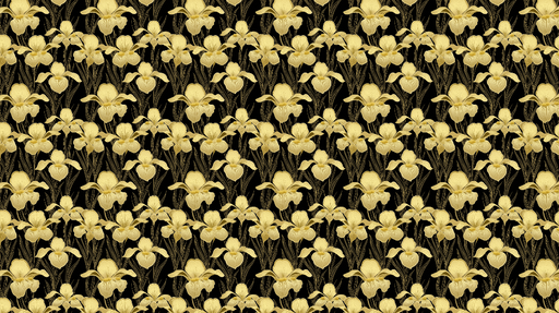 Ogled celotnih podrobnostiFototapet zlata perunika | Cvetlični vzorec na črnem ozadju