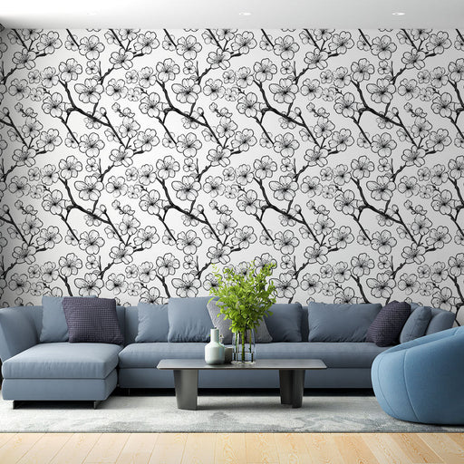 WonderMuralTa ekskluzivna tapeta razkriva nežen vzorec črnih in belih cvetov, ki prikazuje cvetoče veje s presenetljivo realističnostjo. Kontrast med belo oza...