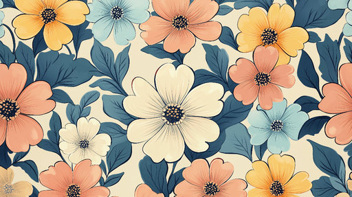 WonderMuralTa ozadje s fresko prikazuje živahen cvetlični vzorec s pisanimi cvetovi v rumeni, modri in roza barvi na mehki kremasti podlagi. Natančni detajli ...