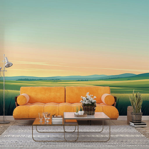 Ogled celotnih podrobnostiStenska poslikava travnik | Pomirjujoča pokrajina zelenih gričev pod pastelno nebo