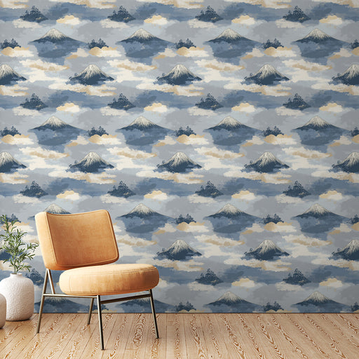 WonderMuralTa fototapeta vzbudi pomirjujoč gorski krajolik, z mogočnimi gorami in nežnimi oblaki, vse okrašeno s toni modre, sive in zlatimi potezami. Vzorec ...